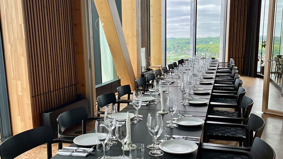 Få en unik mødeoplevelse på 19. etage i TRÆ, med udsigt over Aarhus og uformel fine dining fra restaurant Syv Ni 13.